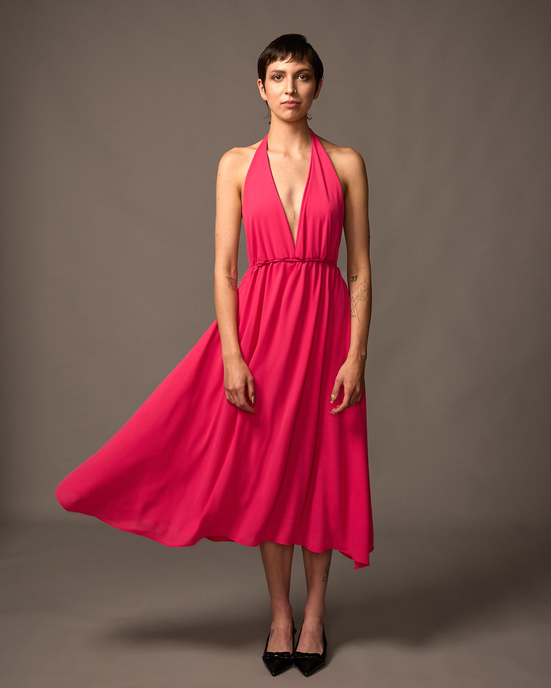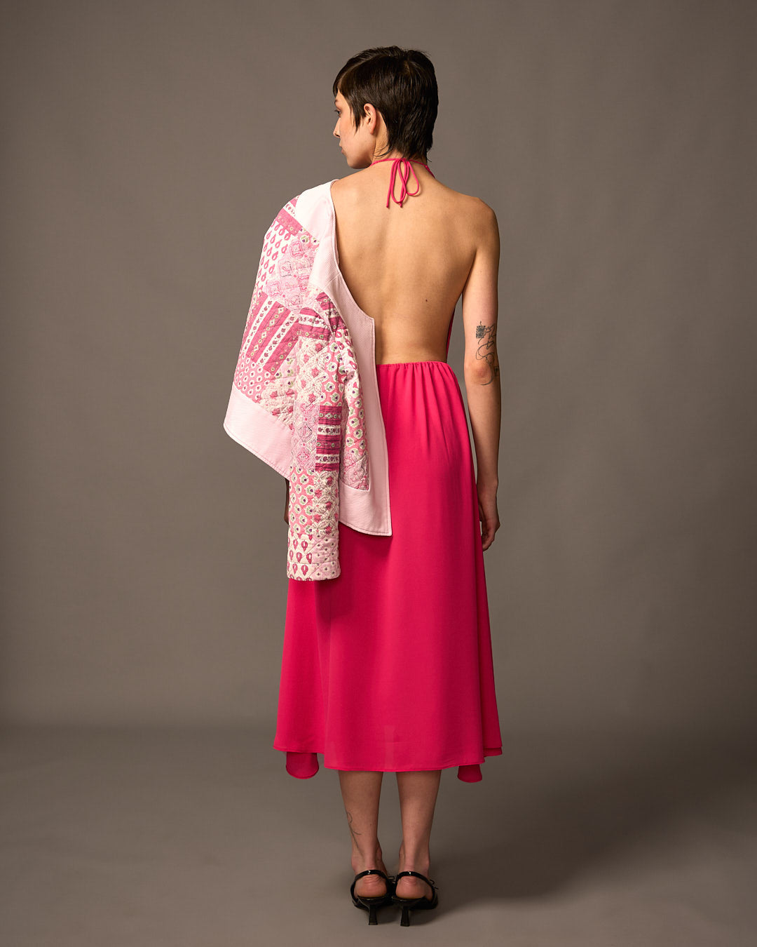 Dos nu, elle s'attache au niveau de la nuque grâce à de fines lanières.